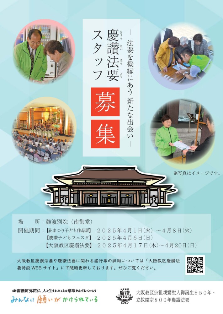 「教区慶讃法要」の厳修、「慶讃子どもフェスタ~集まれ南御堂~」「花まつり子ども作品展」を開催するにあたって、法要期間中の受付や堂内誘導をはじめ白洲の案内、それぞれの行事の準備や片付けなどをお手伝いいただくスタッフを募集いたします。
