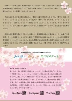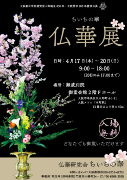ちいちの華2025.03.24★慶讃法要 期間中に 仏華展を開催いたします 大阪教区宗祖親鸞聖人御誕生850年・立教開宗800年慶讃法要期間中に、仏華研究会ちいちの華による仏華展を開催します。4/17~20 御堂会館2階Fホールにて20杯ほど展示する予定ですので、どうぞお誘いあわせの上、ご観覧くださいますようご案内申し上げます。 →PDFファイル この記事は銀杏通信から転載しています
