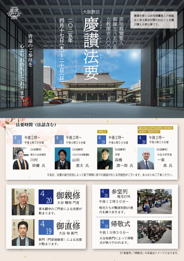 このたびの慶讃法要は、一人ひとりが自らにとっての立教開宗の意味をたずね、本願念仏の教えをいただくかけがえのない大切な「時」と「場」を賜ることであり、自らの聞法生活を問い直し、あらためて念仏申す歩みを確かめていく機縁となることを願いとするものです。