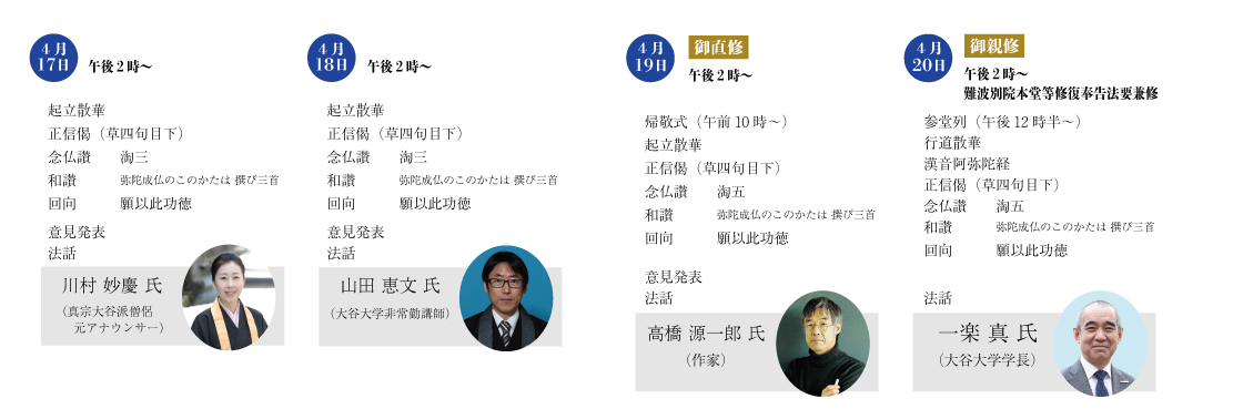 法要の最終日(御満座)は、大谷暢裕御門首導師のもと法要がお勤めされ、難波別院本堂等の修復奉告法要を兼修させていただきます。