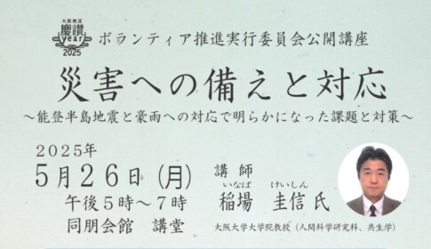 [実]ボランティア推進 5月26日(月)ボランティア公開講座を開催!(ご案内)2025.04.115月26日(月)午後5時から、難波別院同朋会館1階講堂で「ボランティア推進実行委員会公開講座」を開催いたします。 当日は、稲葉圭信氏(大阪大学大学院教授)より「災害への備え~能登半島地震と豪雨への対応で明らかになった課題...