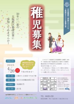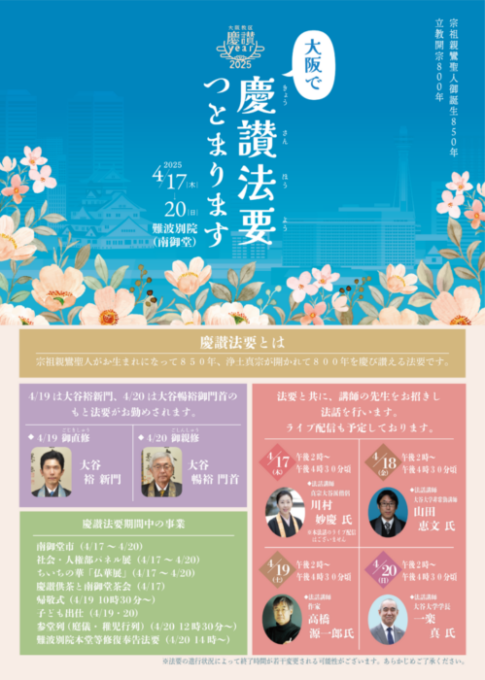 慶讃法要2025年4月17日〜4月20日の4日間大阪教区では宗祖親鸞聖人850年・立教開宗800年慶讃法要が勤まります。 法要最終日4月20日には難波別院本堂等修復奉告法要も兼修され、参堂列(稚児行列)も実施されます。 この参堂...