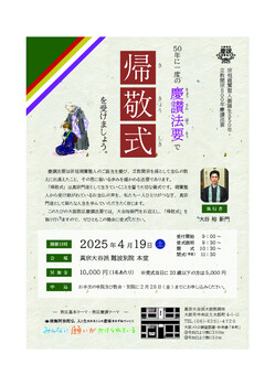 慶讃法要大阪教区宗祖親鸞聖人御誕生850年・立教開宗800年慶讃法要では、大谷裕新門をお迎えし、「帰敬式」執り行います。 帰敬式は、「おかみそり」とも言われ、「仏」「法」「僧」の三宝に帰依し、宗祖親鸞聖人が明らかにされた「教え」...