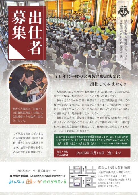 慶讃法要大阪教区では、性別や年齢を超えて共にお勤めをし、お念仏が次世代へと響き、相続されていくことを願っております。 2025年4月17日から20日に厳修されます教区慶讃法要では、その願いを実現するために、出仕者を広く募ります。...
