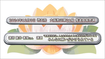 第21組 【第21組】推進員報恩講 法話 動画配信2024.12.14先日12月3日開催の第21組推進員報恩講の法話の動画配信を開始しました。よろしければ、動画を通してご聴聞ください。 日時 2024年12月3日 場所 難波別院 堺支院 講師 藤井 善隆さん 講題 「南無阿弥陀仏 人と生ま...