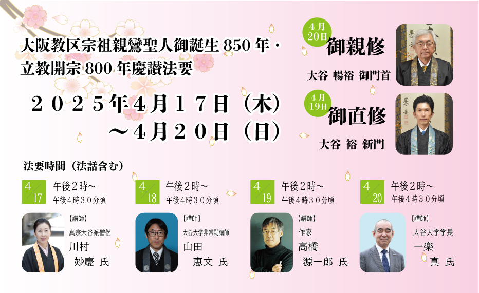 banner01main03-500main03-500main03-500 慶讃WEBサイトからの団体参拝の募集受付は終了いたしました。皆様多数のお申込みありがとうございました。今後の団体参拝に関するお問い合わせ等は、大阪教務所(06-6251-4720)まで直接ご連絡ください。 慶讃法要について 慶讃テーマについて お知らせ 慶讃year教区内5別院1支院報恩講スタンプラリーのご案内2025.09.11慶讃year今月26日に開催!慶讃記念聞法会!【趣旨紹介映像を公開】2025.09.04難度会臘扇忌法要のご案内2025.07.13慶讃year慶讃記念聞法会を開催!2025.06.26慶讃year2024年度 子どものつどい 開催しました2025.05.26慶讃法要教区慶讃法要に組から150名近くが参拝2025.05.09ちいちの華慶讃法要順調に本日三日目です2025.04.19ちいちの華いよいよ明日より慶讃法要!2025.04.16 もっと見る